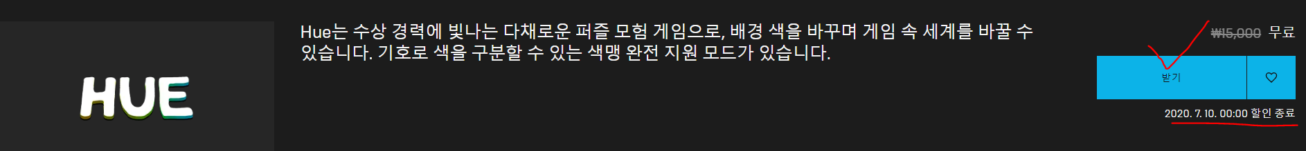 현재 에픽게임즈에서 Hue를 무료로 배포중입니다!