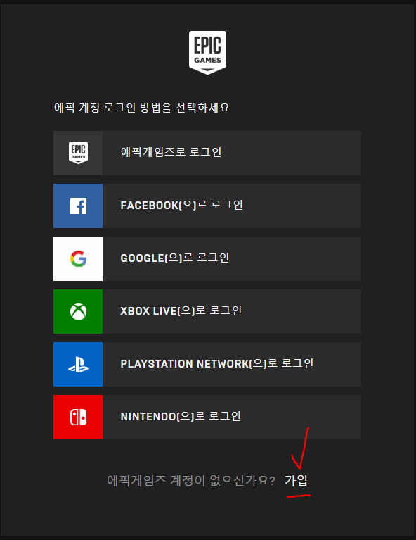 계정이 없다면, 에픽게임즈 계정을 생성합니다. 최하단에 있는 가입을 클릭(빨간 체크)하면 됩니다.
