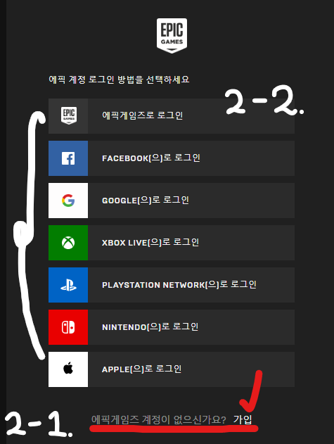 2-1. 계정이 없을 시 : 에픽게임즈 계정을 생성합니다. 최하단에 가입을 클릭(빨간 체크)합니다.