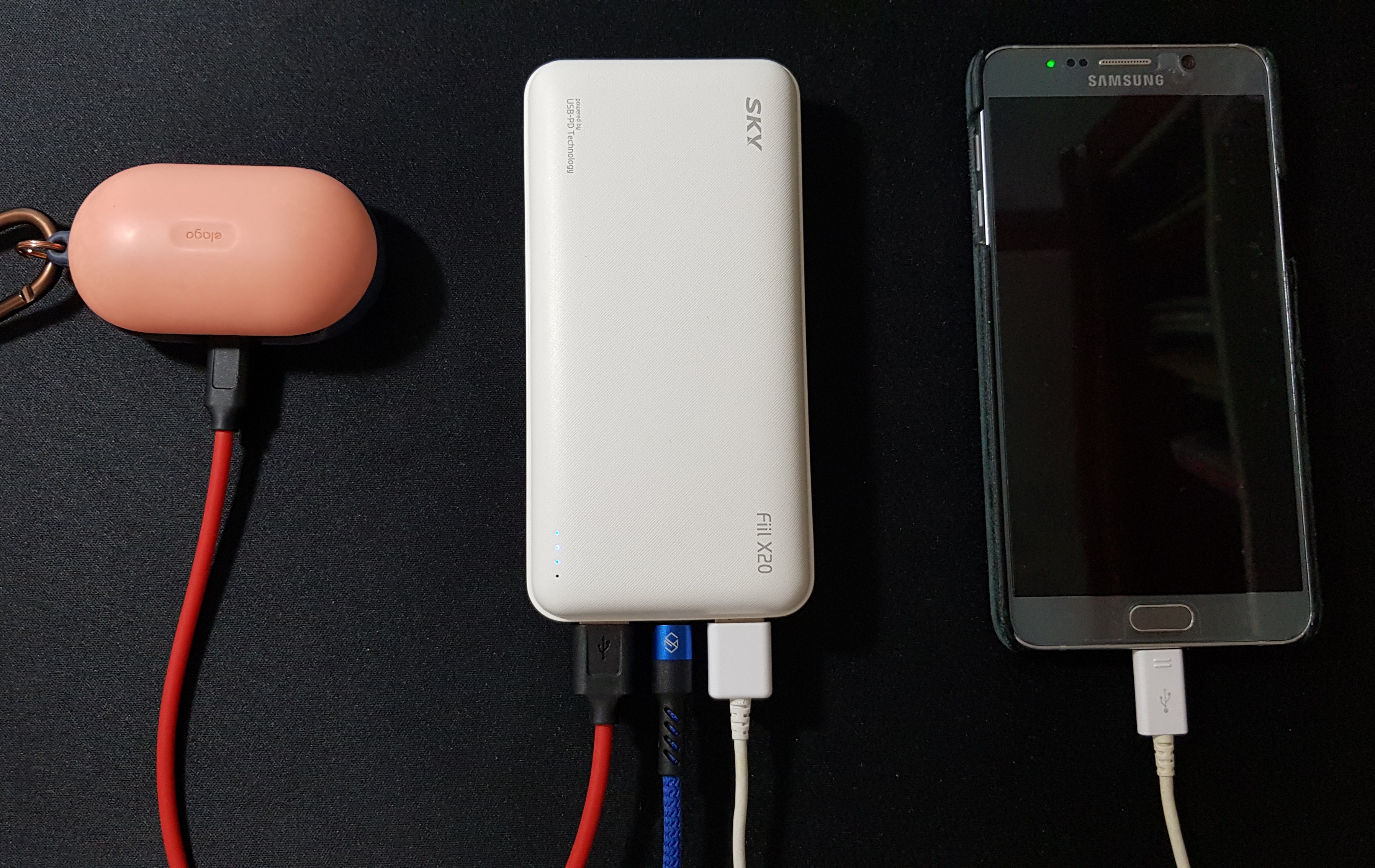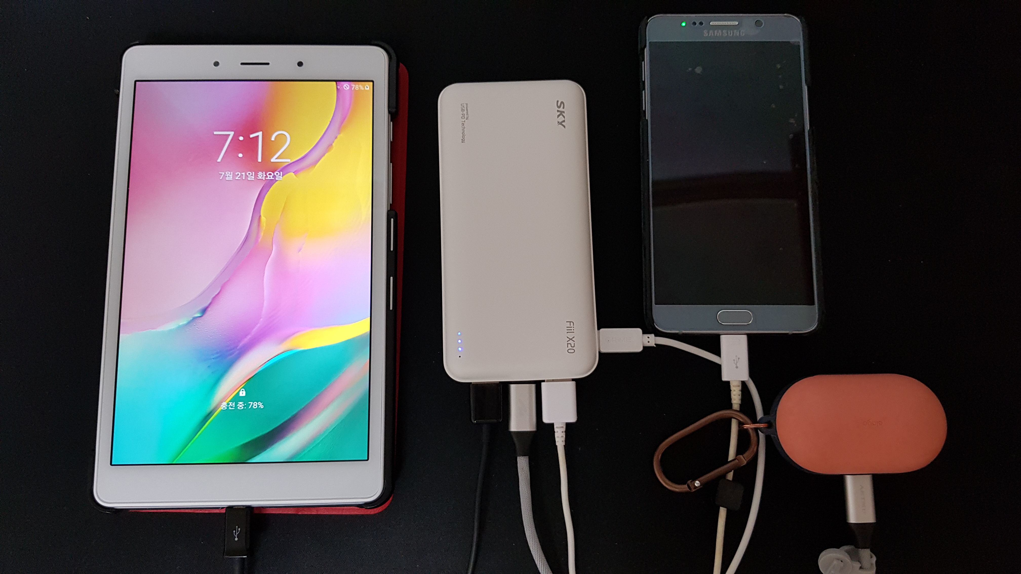 휴대폰과 버즈 및 갤럭시 탭을 충전시키면서, 보조배터리도 함께 충전(micro 5핀)하는 모습입니다.