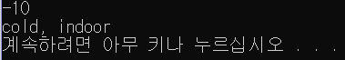 - 0도 미만이면 실내 활동이 바람직하므로 cold, indoor 출력